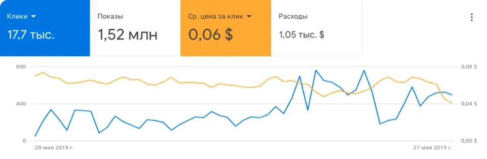 За первый год сотрудничества было получено почти 18.000 кликов на сайт. При этом, общий бюджет составил всего 1000$. Таких показателей удалось достичь используя стратегию показа по низкочастотным и среднечастотным запросам.