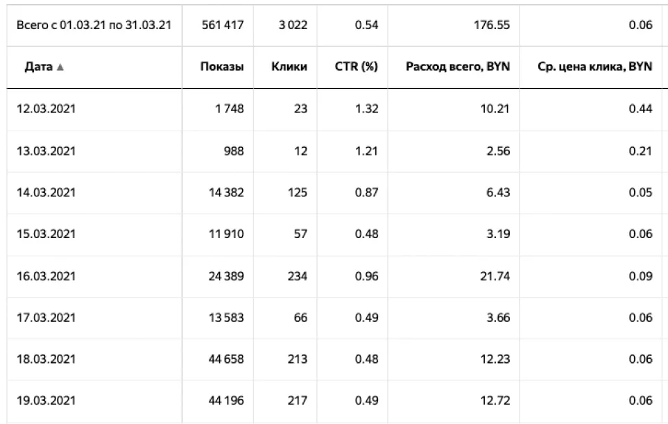 После проведенного анализа было решено в первую очередь запустить рекламу в РСЯ. Всего было подготовлено 6 групп объявлений, для каждой из них разработаны баннеры. Спустя неделю показов были выбраны группы с наилучшим результатом и произведено масштабирование РК. Итого, после окончательной настройки, мы вышли на 3000-3500 кликов в месяц со стоимостью 0.06 BYN.