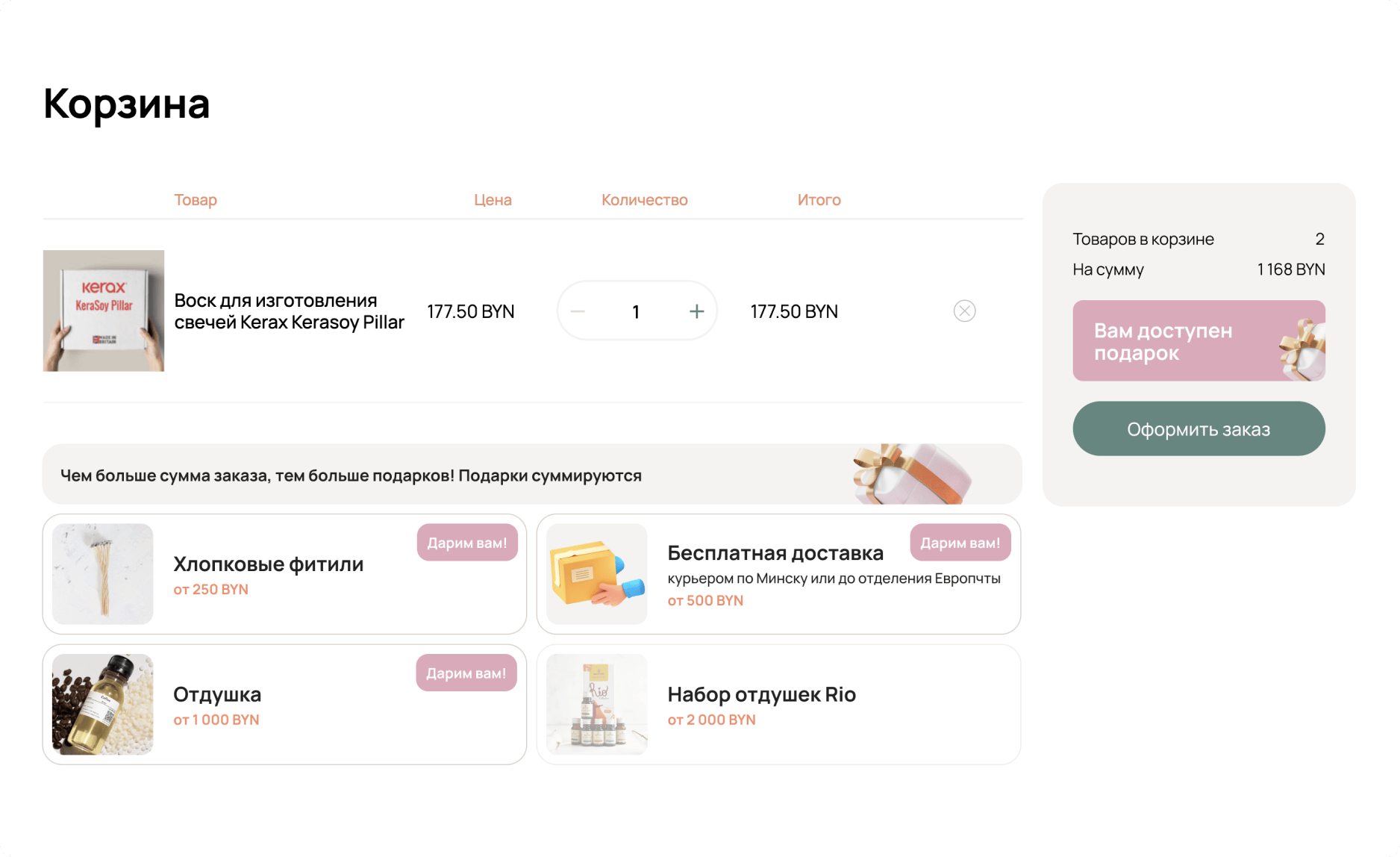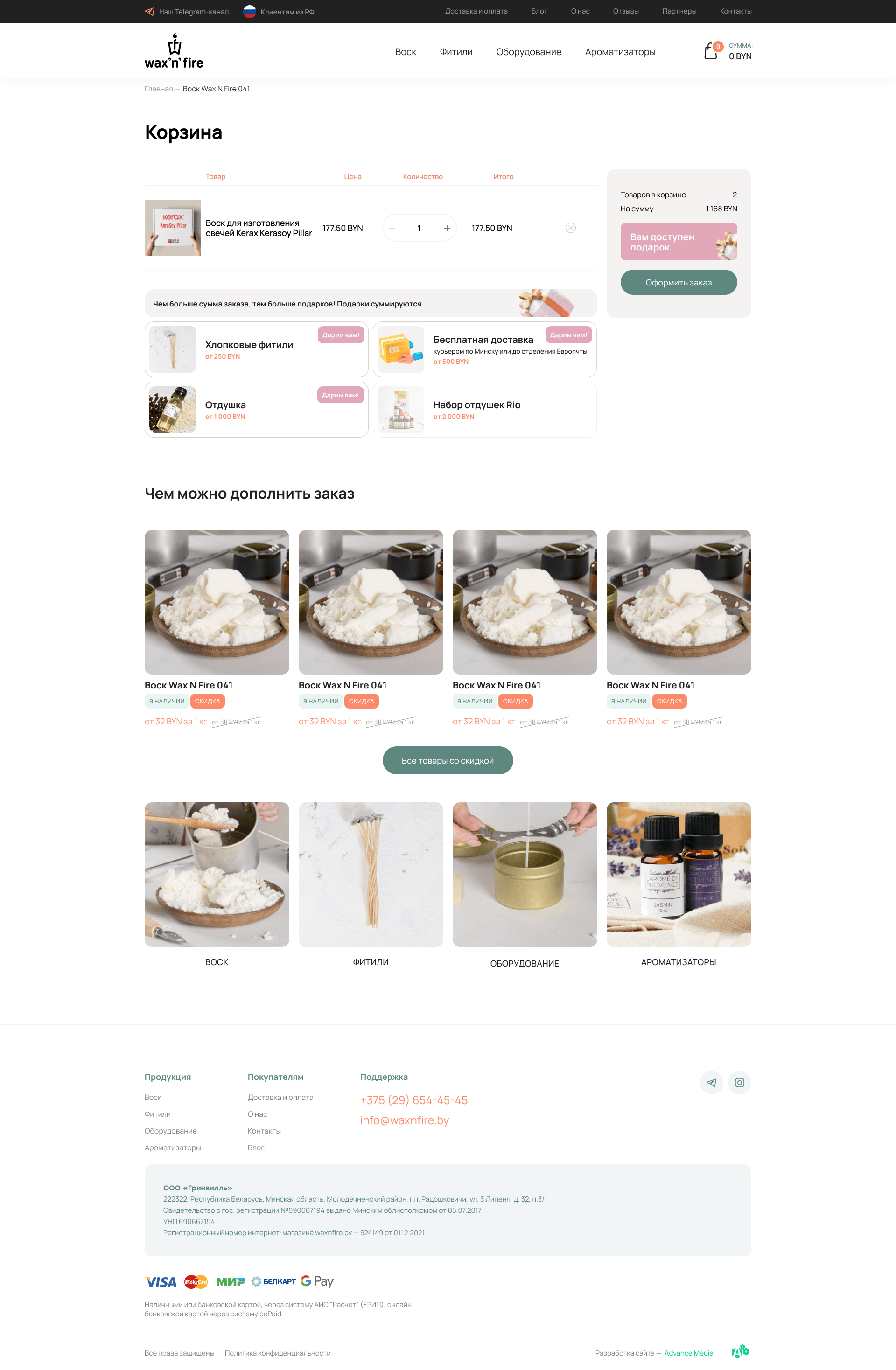 В корзине был реализовано механизм, который мотивирует пользователя увеличить средний чек на одну покупку. Суть функционала заключается в том, что сайт подсказывает пользователю на какую сумму еще нужно приобрести товаров для того, чтобы получить подарок от компании в виде бесплатных фитилей или бесплатной доставки