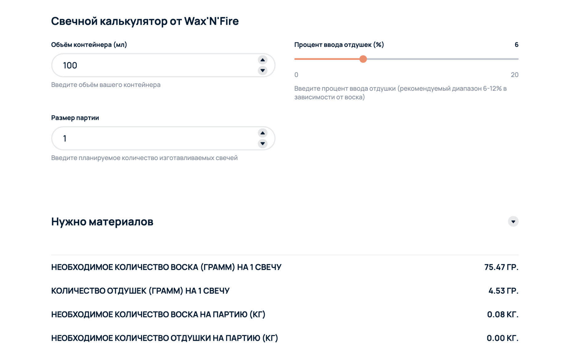 Разработали универсальный калькулятор, с помощью которого любой пользователь может рассчитать требуемое количество расходных материалов для запланированного объема изготовления свечей. Калькулятор наглядно покажет сумму прибыли, которую можно получить исходя из количества произведенных и проданных свечей, а также учтет налоги. Unit калькулятор рассчитает вашу оптимальную цену на 1 свечу, для того чтобы покрыть все расходы и выйти в плюс.